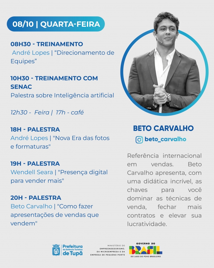 Beto Carvalho – referência internacional em vendas, apresentará técnicas para aumentar contratos e lucratividade.