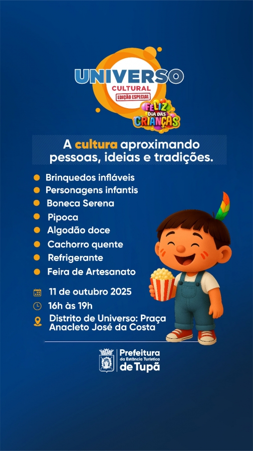 A edição deste mês do Universo Cultural vai ser dedicada ao público infantil do distrito. O evento acontece no sábado (11), véspera do Dia das Crianças, das 16h às 19h, e é realizado na Praça Anacleto José da Costa no distrito de Universo.