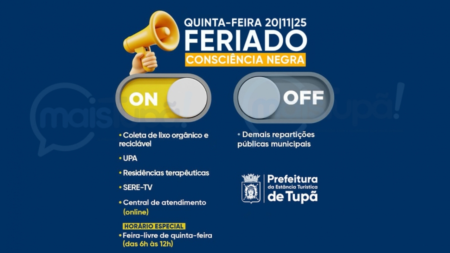 Com o feriado do Dia da Consciência Negra, a Prefeitura de Tupã decretou ponto facultativo na sexta-feira (21). Por isso, alguns serviços públicos terão funcionamento alterado. A feira livre da Praça da Bandeira funcionará no período da manhã, das 6h às 12h. As feiras de sexta, no jardim Santa Adélia, e de domingo, não terão alteração.