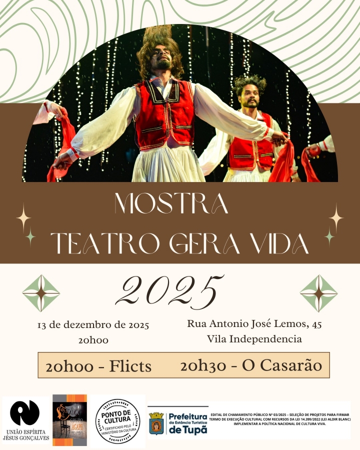 O Grupo Ágape de Teatro realiza, neste sábado, 13 de dezembro de 2025, a Mostra “Teatro Gera Vida”, evento que marca o encerramento de dois importantes projetos contemplados pelos Editais de Chamamento Público financiados com recursos da Lei Aldir Blanc.