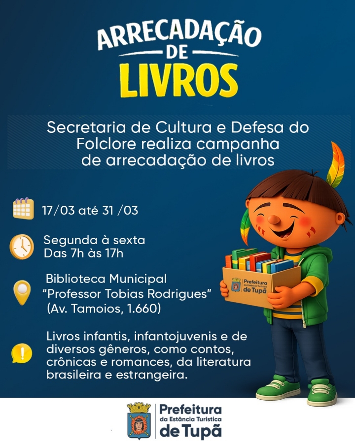 A Secretaria de Cultura e Defesa do Folclore inicia no próximo dia 17 de março mais uma campanha de doação de livros para a Biblioteca Municipal “Professor Tobias Rodrigues”.