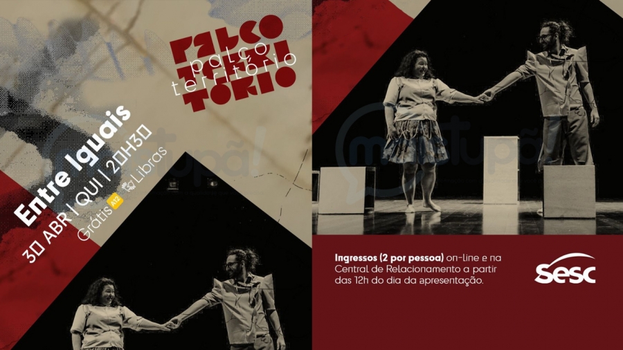 O espetáculo, intitulado “Entre Iguais”, integra o projeto Palco Giratório, e será apresentado no dia 30 de abril, às 20h30, com entrada gratuita e classificação livre. Os ingressos, limitados a dois por pessoa, poderão ser retirados on-line e também na Central de Relacionamento a partir das 12h do dia da apresentação. A iniciativa conta com realização do SESC.