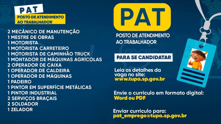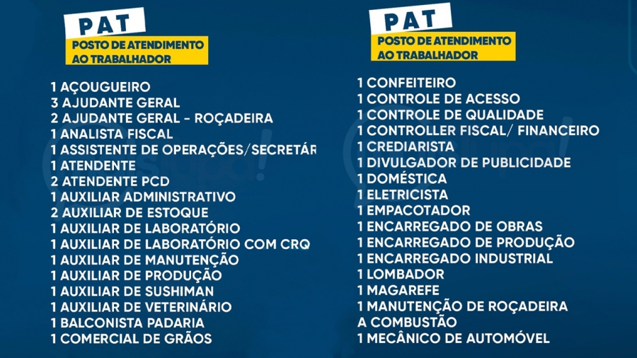 O Posto de Atendimento ao Trabalhador (PAT) está com 57 vagas de emprego abertas nesta semana, oferecendo oportunidades em diversas áreas e para candidatos com diferentes níveis de formação e experiência.