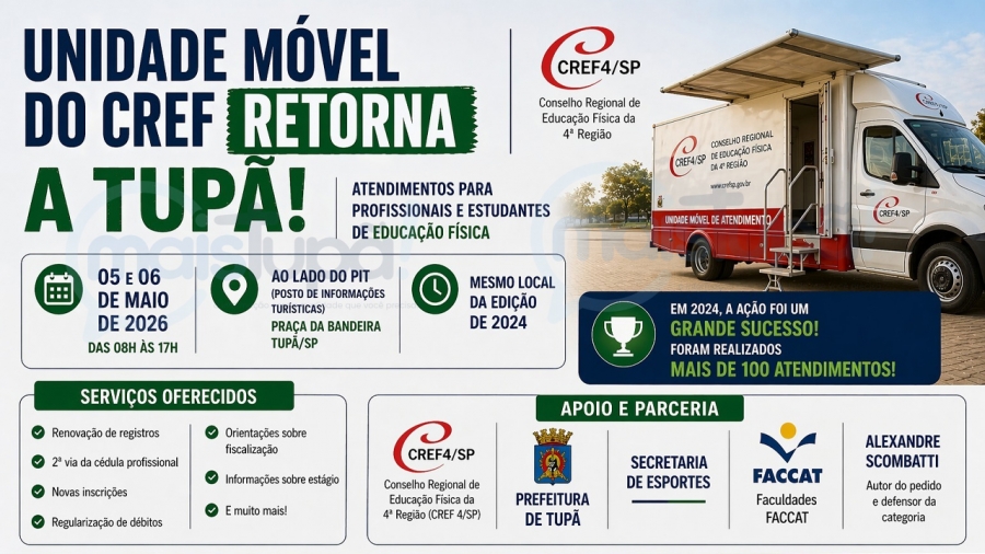 A Unidade Móvel do Conselho Regional de Educação Física da 4ª Região (CREF4/SP) já tem data confirmada para retornar à Estância Turística de Tupã. O atendimento acontecerá nos dias 05 e 06 de maio de 2026, das 08h às 17h, e será realizado ao lado do PIT (Posto de Informações Turísticas), na Praça da Bandeira — mesmo local onde a estrutura foi instalada na última visita à cidade.