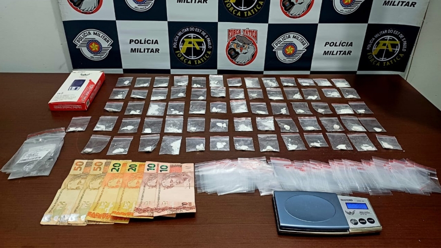 Os policiais conseguiram impedir o fechamento e iniciaram o acompanhamento a pé. O homem correu pelos cômodos da casa e, ao entrar no banheiro, foi visto escondendo um objeto no cesto de lixo. Durante a abordagem, ele foi identificado e submetido à busca pessoal. No cesto, os militares encontraram 66 embalagens tipo “zip lock” contendo cocaína, além de dezenas de outras idênticas, porém vazias.