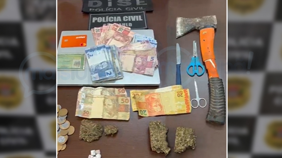 Durante o cumprimento do mandado, os policiais civis surpreenderam os dois homens em um imóvel situado na Vila Lahoz. No local, foram encontrados dois tabletes de maconha, cinco porções de crack embaladas para venda, dinheiro trocado — característico da comercialização de drogas —, além de instrumentos utilizados para fracionamento, como faca, tesouras e machadinho. Também foram apreendidos um notebook, documentos em nome de terceiros e um cartão bancário.