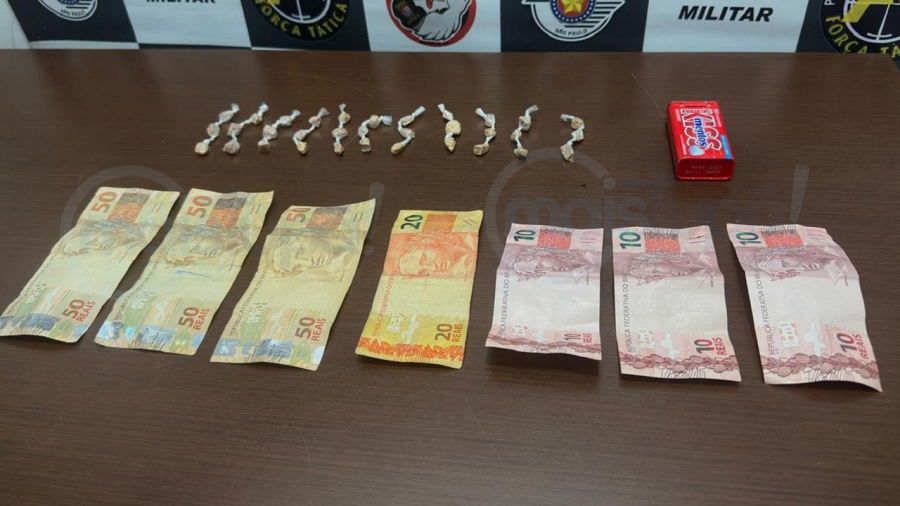 A equipe iniciou acompanhamento e conseguiu abordá-lo na Rua Evaristo Quinquio. Na revista pessoal, os policiais encontraram R$ 200 em dinheiro e um recipiente metálico contendo 33 porções de crack.