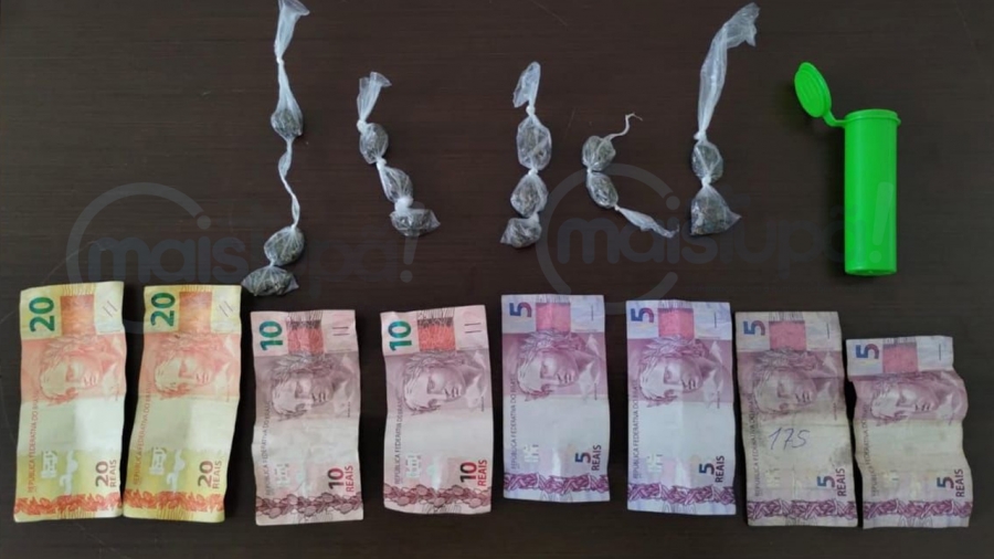 Durante a revista, os policiais encontraram um pote laranja contendo 13 porções de maconha e R$ 15. Em busca pessoal, foi encontrado mais entorpecente em sua posse.