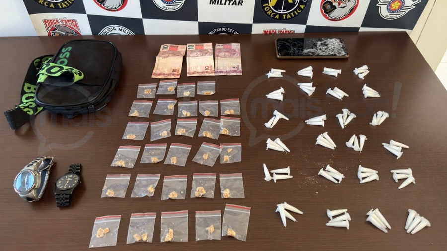 No interior da residência, sobre um sofá, foram encontrados 72 pinos de cocaína, 29 invólucros do tipo zip lock contendo crack, além R$ 29,00 em dinheiro, dois relógios e documentos pessoais.