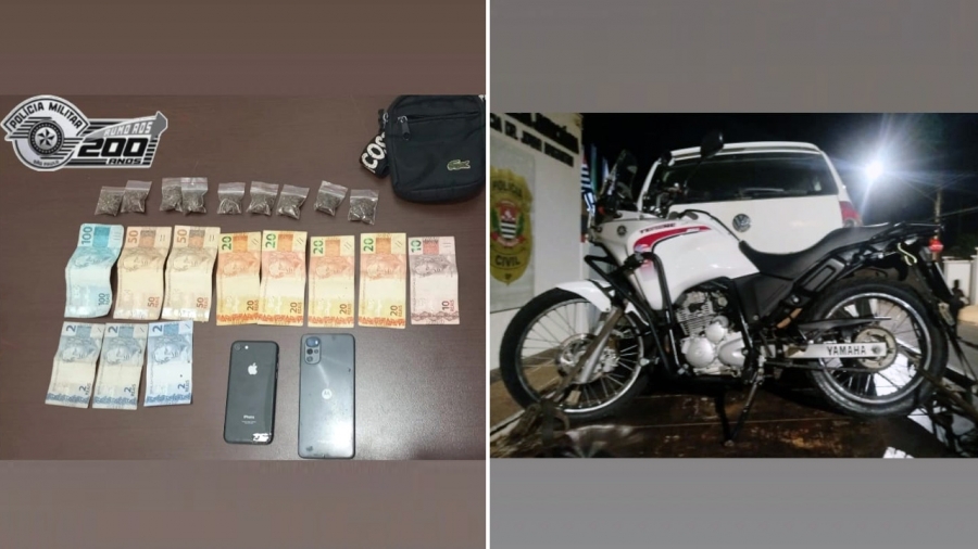 Na pochete, foram localizadas nove porções de maconha, acondicionadas em embalagens tipo ziplock, prontas para comercialização, além de dois celulares, sendo um Motorola preto e um iPhone 8, e a quantia de R$ 296,00 em notas fracionadas.