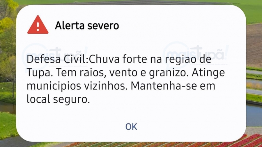 A Defesa Civil do Estado de São Paulo emitiu, na tarde desta terça-feira (18), às 15h31, um alerta preventivo de chuva forte e persistente para o município de Tupã. A notificação foi enviada por meio do sistema “Defesa Civil Alerta – Ferramenta Cell Broadcast”, que dispara mensagens diretamente para celulares localizados nas áreas de risco.