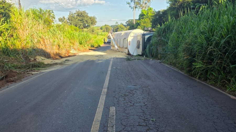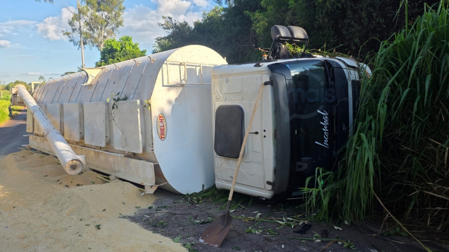 Caminhão carregado com ração tomba e interdita parcialmente a vicinal que liga Tupã a Bastos