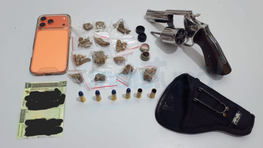 No entanto, durante vistoria no interior do veículo, os agentes localizaram uma bolsa contendo 13 porções de maconha e duas porções de haxixe, todas embaladas separadamente. Na sequência das buscas, foi encontrado sob o banco do passageiro um revólver calibre .38, com quatro munições intactas e duas já deflagradas.