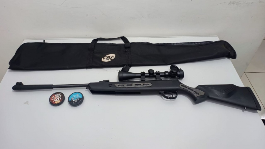 Ainda durante a ação, os policiais apreenderam uma carabina de pressão com luneta, localizada no porta-malas, além de dois recipientes contendo chumbinhos.