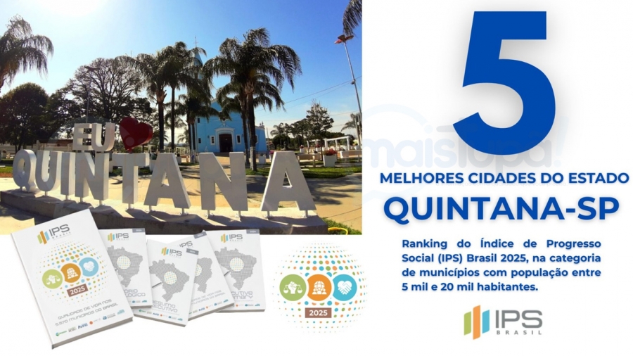 Quintana conquistou um importante reconhecimento: está entre as cinco melhores cidades do Estado de São Paulo no Índice de Progresso Social (IPS) Brasil 2025, na categoria de municípios com população entre 5 mil e 20 mil habitantes. O resultado consolida o município como referência em gestão pública e reafirma a transformação vivida nos últimos anos.
