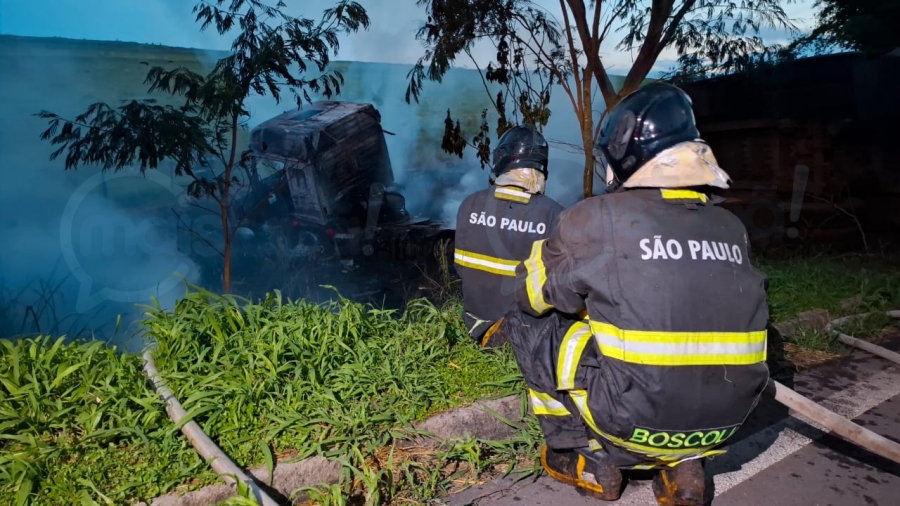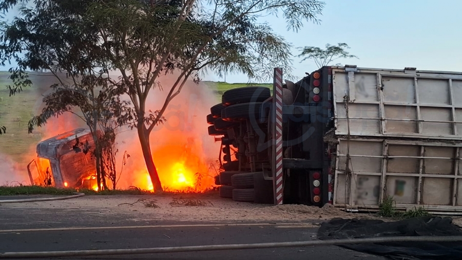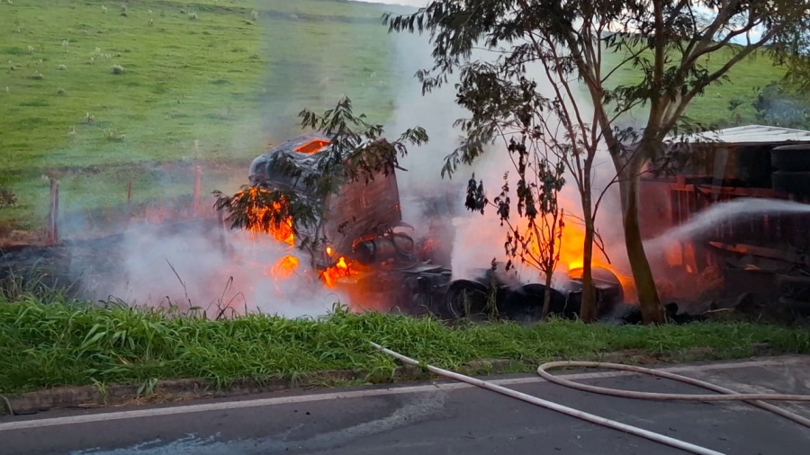 O motorista não conseguiu frear, a carreta invadiu a pista contrária e acabou parando em uma ribanceira às margens da rodovia. Em seguida, o veículo foi tomado pelas chamas.