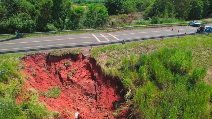 O trecho da rodovia foi totalmente interditado após a abertura de uma cratera provocada pelas fortes chuvas. A erosão comprometeu a estrutura da pista e gerou risco de desmoronamento.