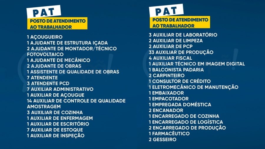O Posto de Atendimento ao Trabalhador (PAT) inicia 2026 da mesma maneira que fechou o ano passado: com grande oferta de vagas de emprego. São oportunidades para profissionais das mais diversas áreas, com os mais diversos níveis de formação. Segundo a relação emitida pelo órgão, são quase 150 postos em aberto.