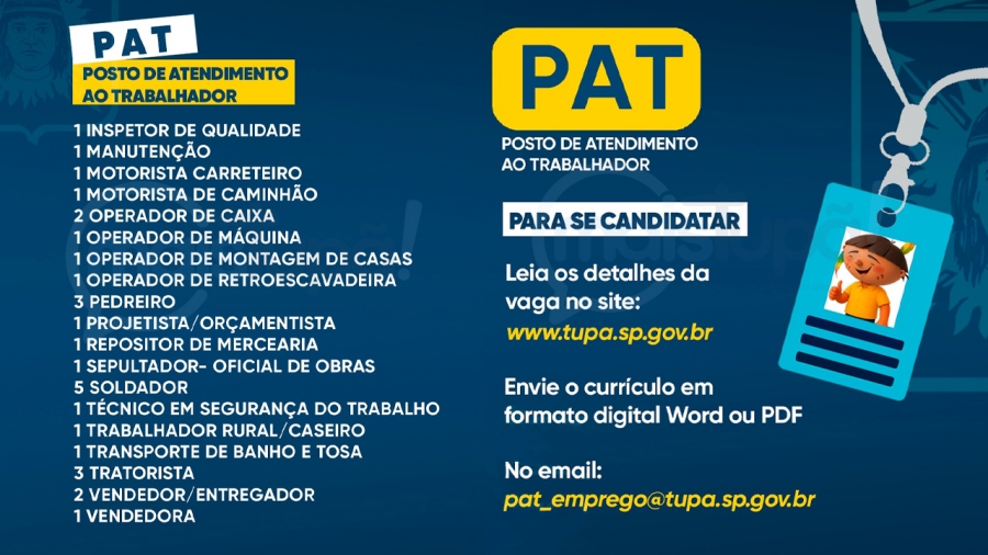 Para mais informações, os interessados devem se encaminhar ao PAT, que fica na rua Guaianazes, 70, na Praça da Bandeira, e funciona junto à Secretaria de Desenvolvimento Econômico e Comércio Exterior. O atendimento acontece de segunda a sexta-feira, das 7h30 às 11h30 e das 13h às 17h. O órgão disponibiliza também informações através do whatsapp: (14) 99888-1522.