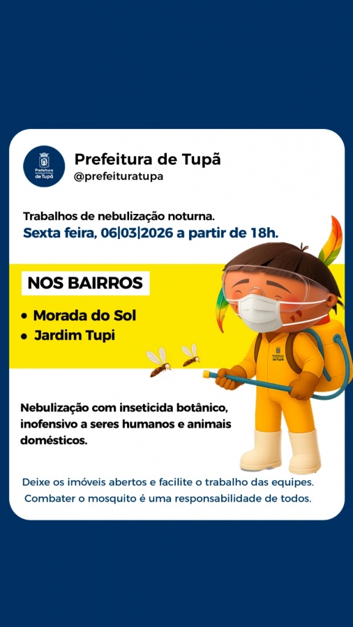 O trabalho teve início na quarta-feira (4), quando as equipes percorreram os bairros Parque dos Antúrios e Conjunto Habitacional Antônio Pereira Gaspar. A ação terá continuidade nesta sexta-feira (6), a partir das 18 horas, com a nebulização na região dos bairros Morada do Sol e Jardim Tupi.